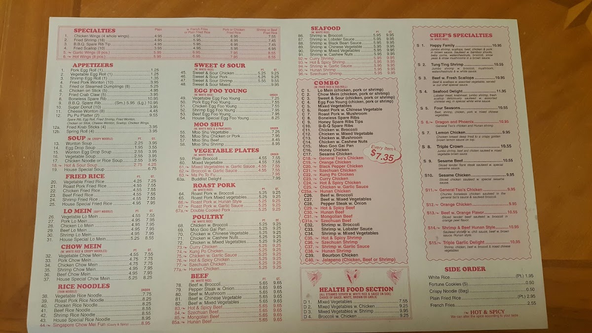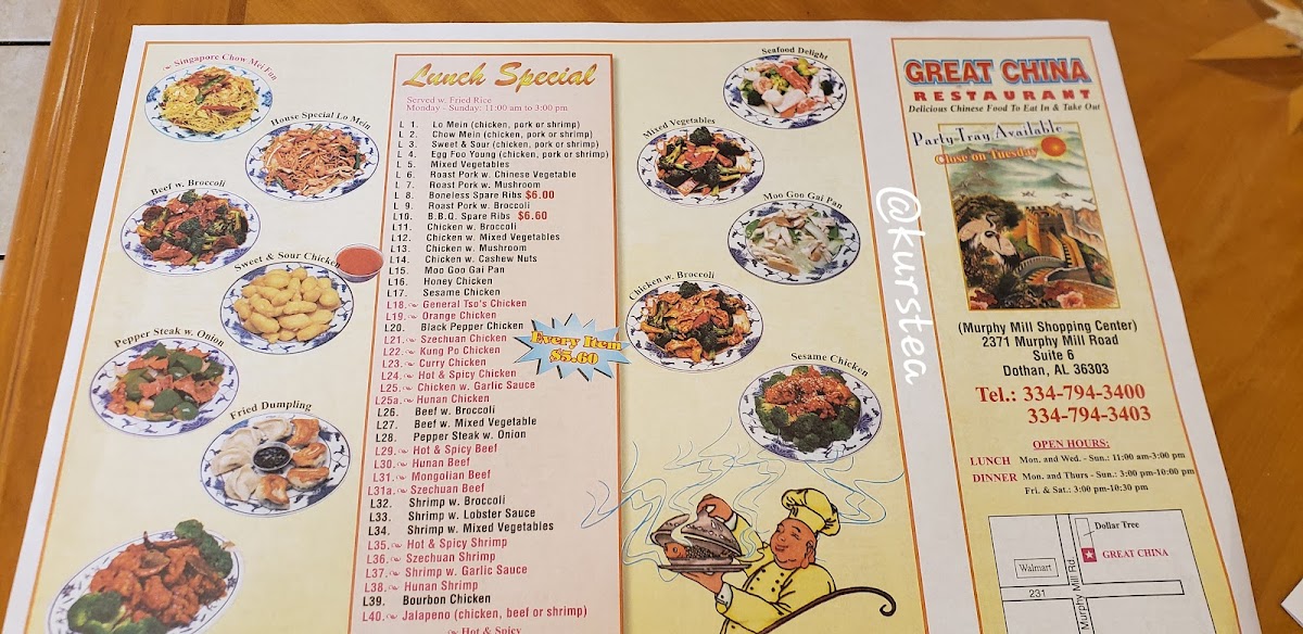 Standout menu items include the succulent Egg Foo Young, praised for its comforting flavors, and crispy egg rolls known for their delightful texture. Diners frequently rave about the speedy service and warmth of the staff, making every visit feel special. Whether you're grabbing a quick lunch or enjoying a meal with friends, Great China welcomes you for an enjoyable dining experience filled with unbeatable flavors.