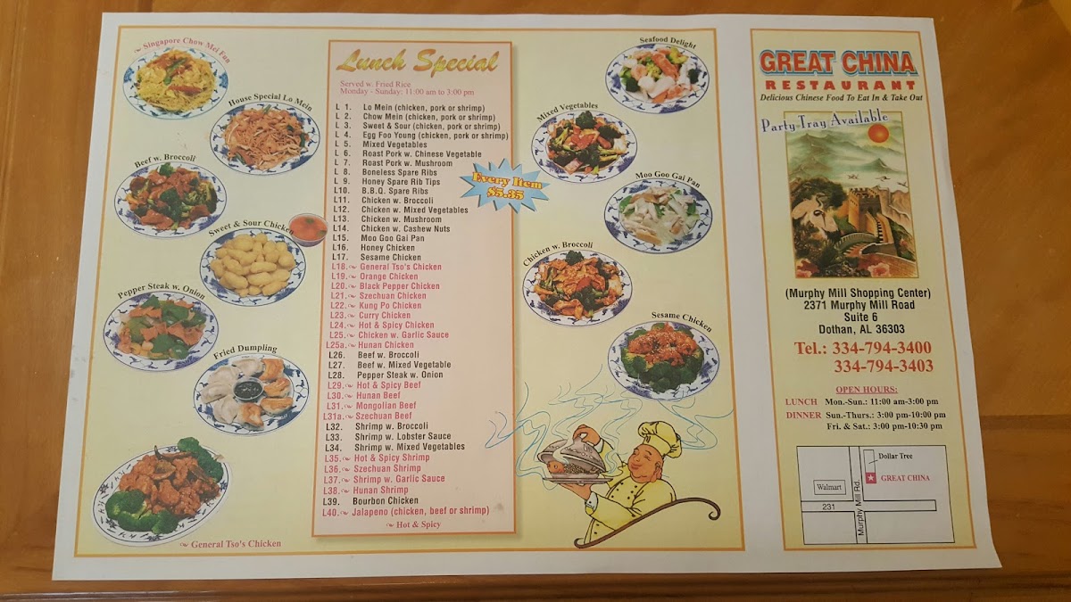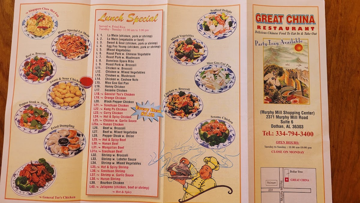 At Great China - Dothan, diners are treated to a tantalizing menu that captures the essence of authentic Chinese cuisine. Located at 2371 Murphy Mill Rd #6, Dothan, this popular eatery excels in offering a diverse selection of dishes to satisfy any palate. Their vegetable plates, featuring options like General Tso’s Tofu and Mixed Vegetable W. Garlic Sauce, promise a fresh and flavorful experience, while meat lovers can enjoy robust flavors in dishes such as Mongolian Beef and Szechuan Beef.